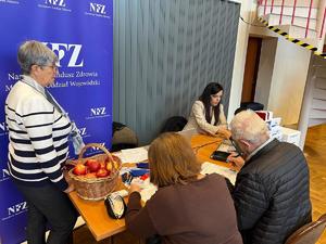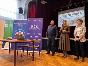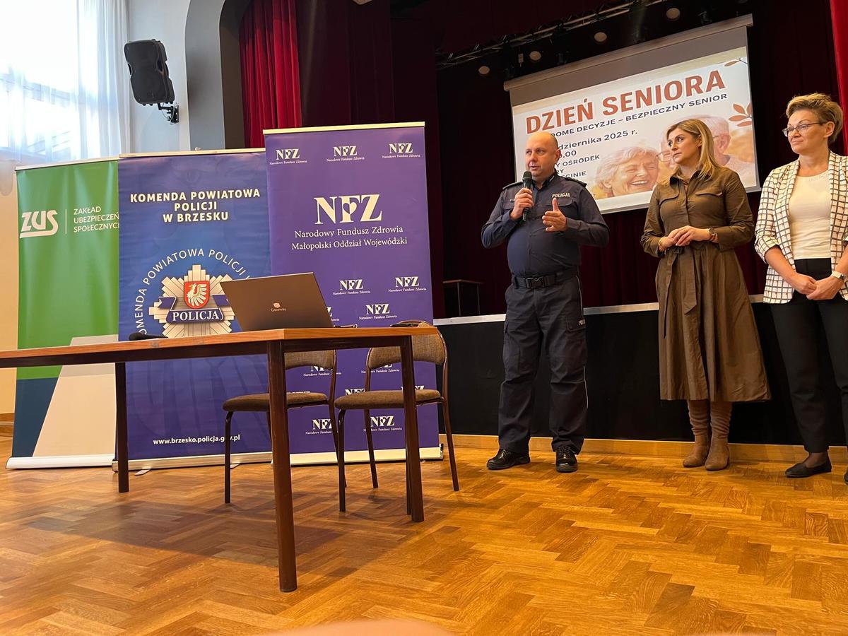 Seniorzy z gminy Borzęcin, którzy dzisiaj, 16 października br. pojawili się w Gminnym Ośrodku Kultury w Borzęcinie zostali powitani przez Sekretarz Urzędu Gminy Borzęcin Panią Edytę Groblicką-Kuc, I Zastępcę Komendanta Powiatowego Policji w Brzesku nadkom. Andrzeja Górkę oraz Kierownika Gminnego Ośrodka Pomocy Społecznej w Borzęcinie Katarzynę Ciochoń. Uczestnicy spotkania skorzystali z atrakcji przygotowanych specjalnie dla nich. Seniorzy uczestniczyli w prelekcji przedstawicieli ZUS-u dot. świadczeń wspierających dla osób z niepełnosprawnościami, prelekcji dot. bezpieczeństwa seniorów w ruchu drogowym oraz informacji jak nie paść ofiarą oszustów przekazanych przez policjanta. Ponadto uczestnicy spotkania mogli zasięgnąć ważnych informacji w punktach konsultacyjno-informacyjnych przygotowanych przez przedstawicieli ZUS-u oraz NFZ-u. W trakcie spotkania wszystkie zainteresowane osoby uzyskały wyczerpujące informacje w zakresie: świadczenia wspierającego dla osób z niepełnosprawnościami, aktualnych projektów - aktywny rodzic, bezpiecznie zdrowo bezgotówkowo, mLegitymacji, emerytur (przeliczenie świadczeń, waloryzacja, praca na emeryturze) czy programu „Aktywny Rodzic”. W trakcie dyżuru doradcy NFZ wyjaśniali jak: tworzyć zdrowy jadłospis z portalem diety.nfz.gov.pl, aktywować Internetowe Konto Pacjenta, korzystać z bezpłatnych aplikacji MojeIKP, mojeFizjo+. Podczas konsultacji zainteresowani mogli wyrobić Europejską Kartę Ubezpieczenia Zdrowotnego (EKUZ) oraz dowiedzieć się jak: załatwić sprawę bez wychodzenia z domu przez wideo spotkanie z e-Doradcą, skorzystać z „cichej godziny", zarezerwować wizytę w celu wykonania podstawowych pomiarów w „kiosku profilaktycznym".